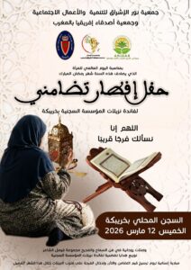 في إطار العمل الإنساني وترسيخ قيم التضامن خلال شهر رمضان المبارك، تنظم جمعية نور الإشراق للتنمية والأعمال الإجتماعية بشراكة مع جمعية أصدقاء إفريقيا بالمغرب حفلا إفطاريا تضامنيا لفائدة نزيلات السجن المحلي بخريبكة، وذلك يوم الخميس 12 مارس 2026.